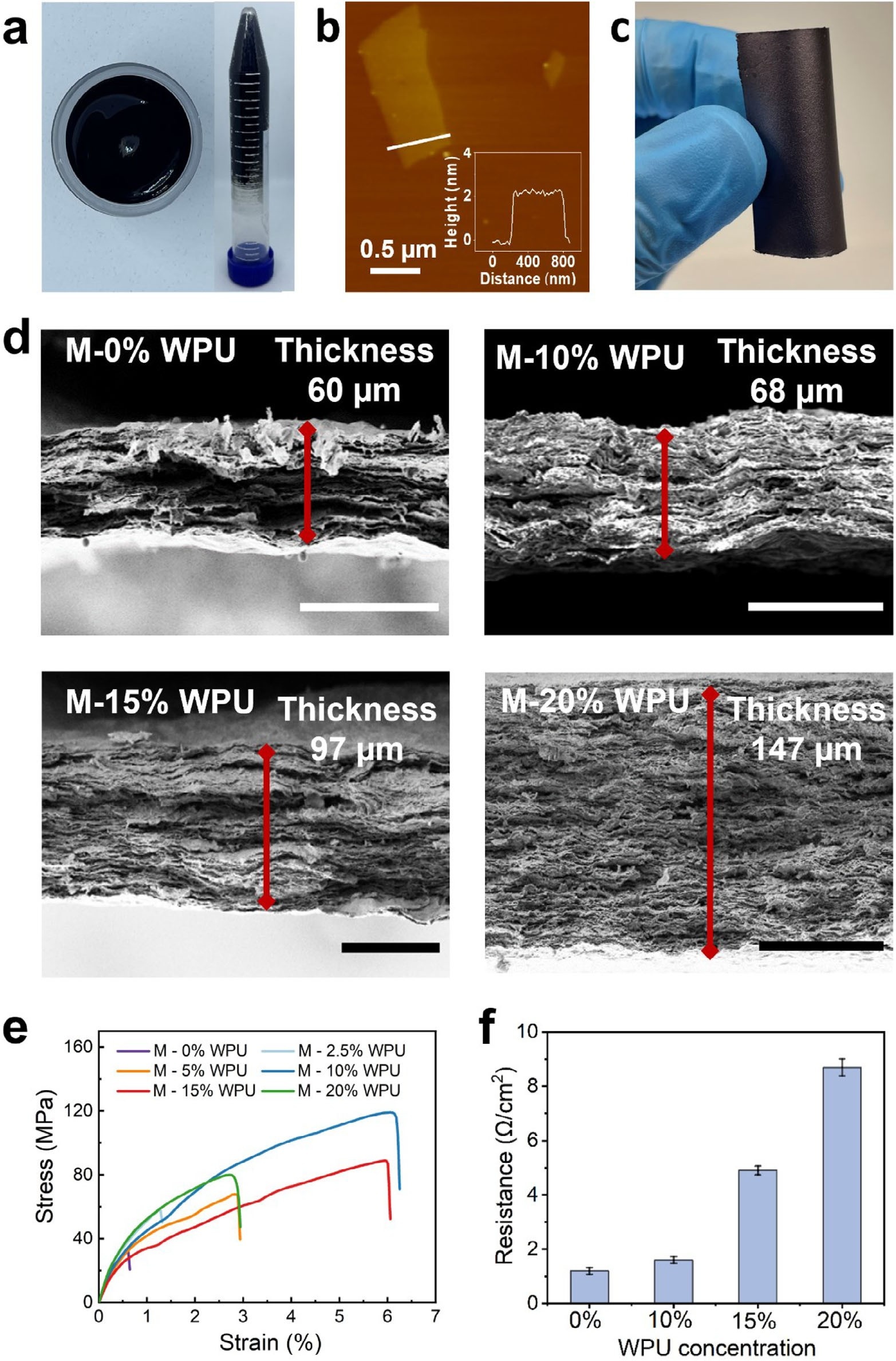2. 界面作用機(jī)制:WPU與MXene表面官能團(tuán)(-OH)形成動(dòng)態(tài)氫鍵網(wǎng)絡(luò)(圖1b),實(shí)現(xiàn)三大作用: