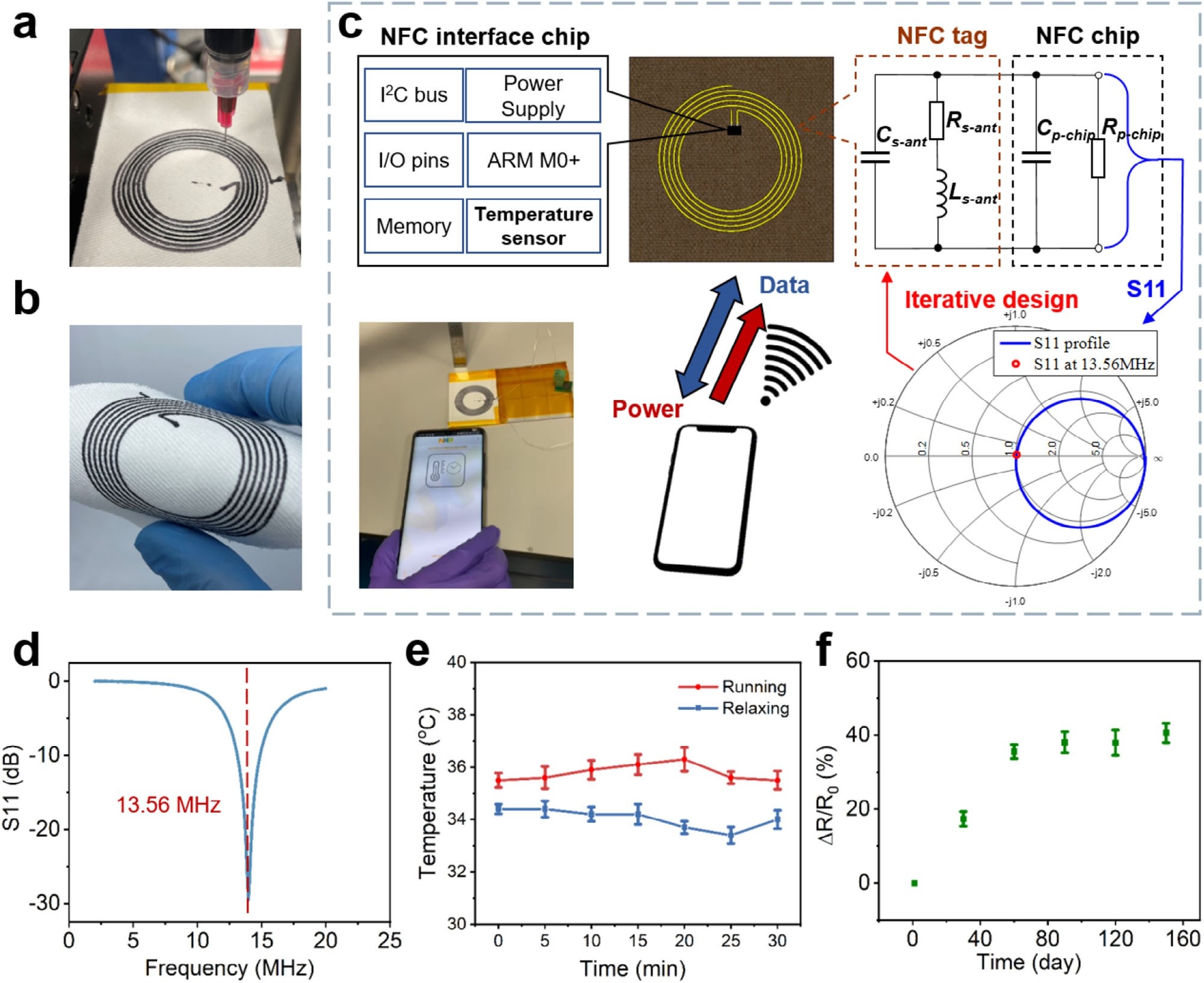 2. 無線功能:嵌入商用溫度傳感器(NHS3100,NXP),通過NFC-enabled智能手機(jī) harvesting電磁能(無需電池),監(jiān)測(cè)距離~1 cm,共振頻率13.56 MHz(圖4d)。