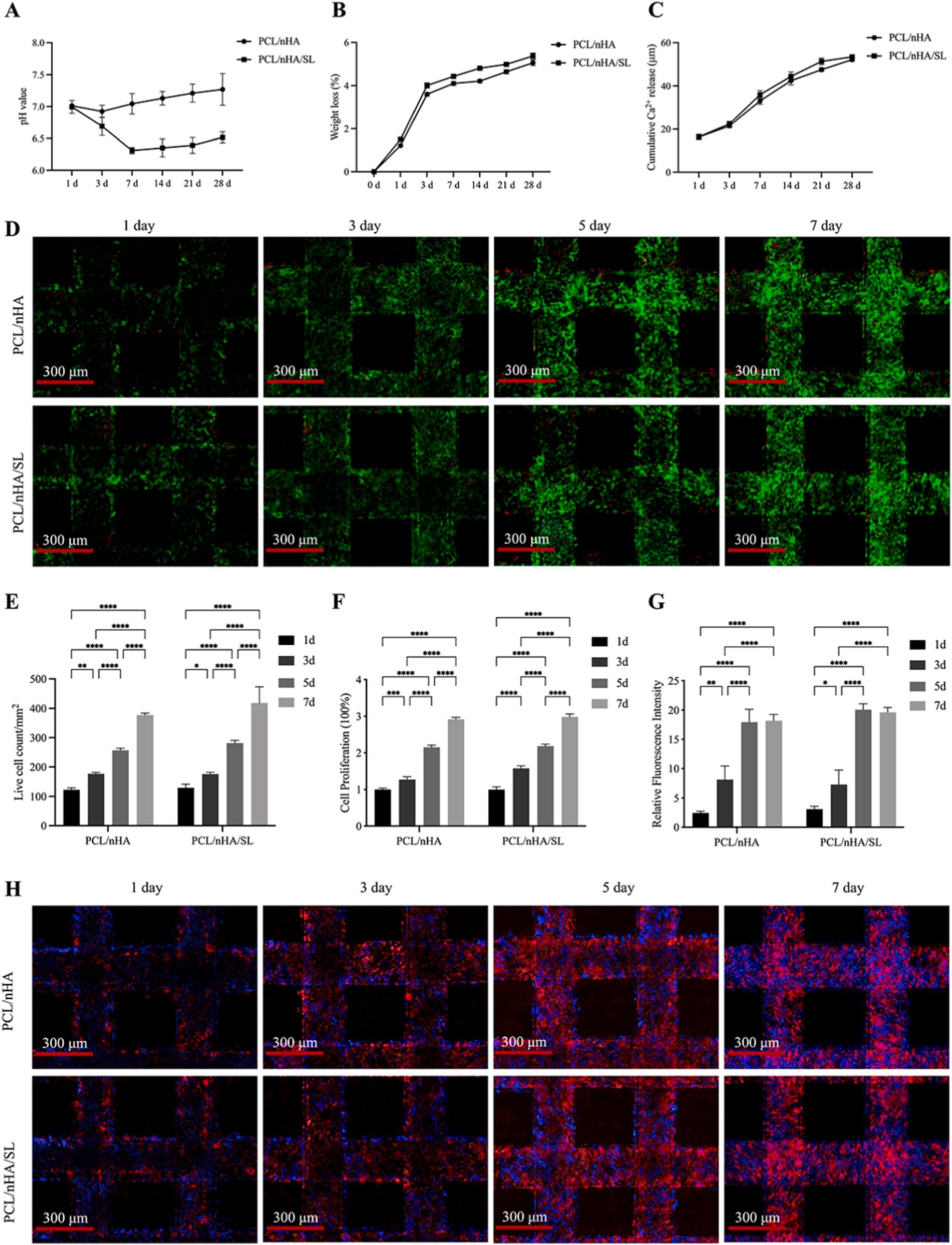 使用人BMSCs(ATCC? PCS-500-012?),在含10%胎牛血清(FBS)和1%青霉素/鏈霉素的DMEM培養(yǎng)基中培養(yǎng)(37℃、5% CO?),選用第3代細胞進行實驗;支架接種密度為4×10?個細胞/支架,分別采用基礎(chǔ)培養(yǎng)基或成骨誘導(dǎo)培養(yǎng)基(含0.1 mM地塞米松、8 mM β-甘油磷酸鈉、50 μg/mL抗壞血酸)培養(yǎng),每3天換液。