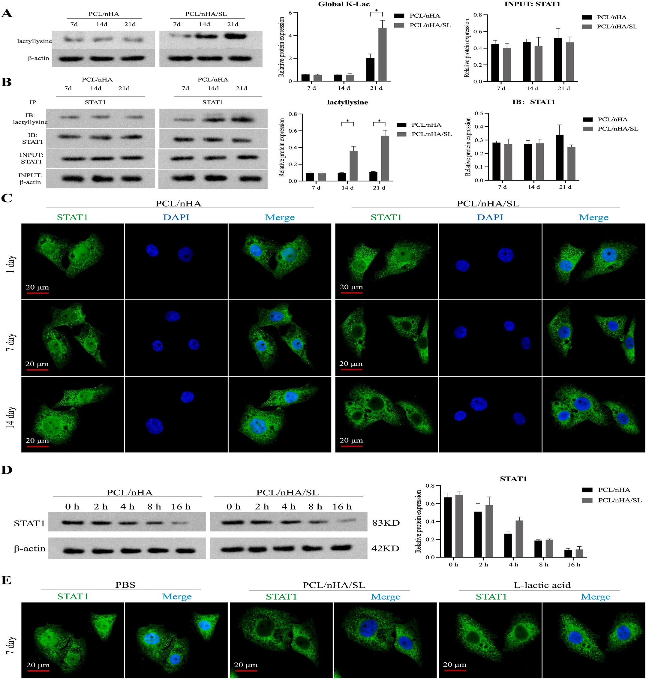 BMSCs在PCL/nHA/SL或PCL/nHA支架上培養(yǎng)14天后,提取蛋白并胰酶消化,采用抗K-Lac抗體偶聯(lián)磁珠富集乳酸化肽段,通過4D無標(biāo)記LC-MS/MS(timsTOF Pro質(zhì)譜儀,Bruker)分析;使用MaxQuant(v1.6.15.0)匹配UniProt人類數(shù)據(jù)庫(2022),篩選差異乳酸化位點(FC>1.5,P<0.05),并進行GO/KEGG富集分析(Fisher精確檢驗,P<0.05);手動驗證STAT1-K193乳酸化(Mascot評分>200,定位概率>99%)。