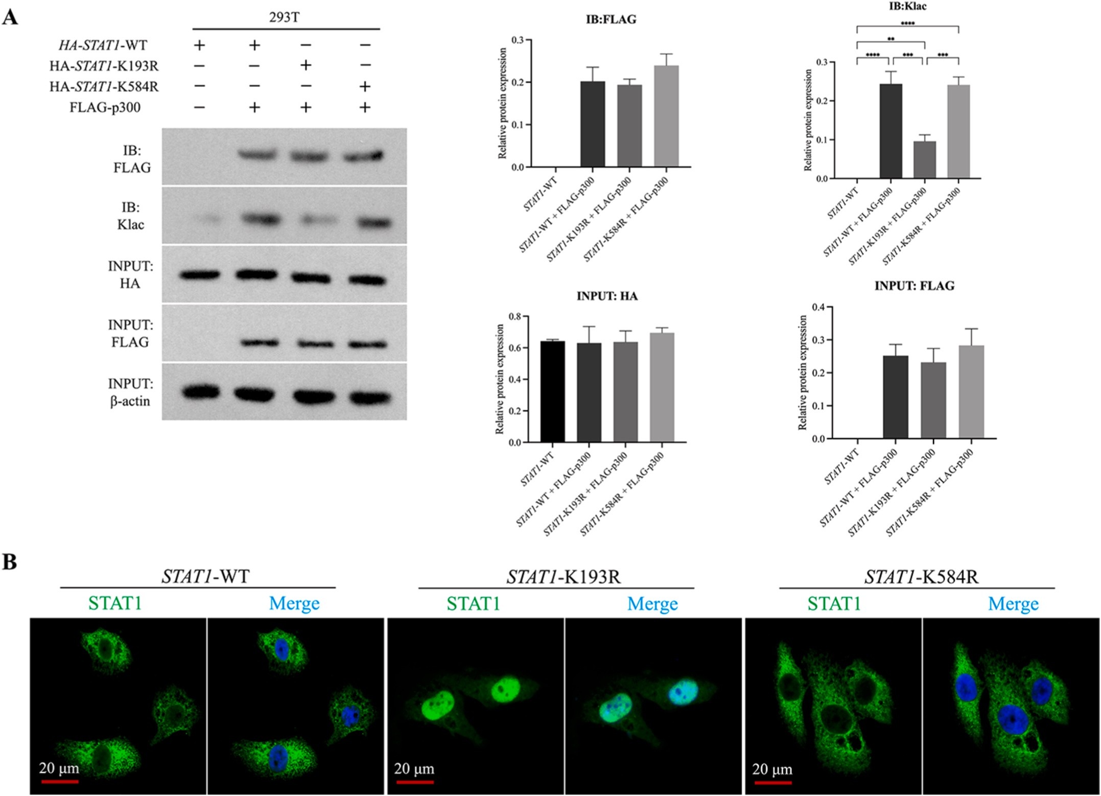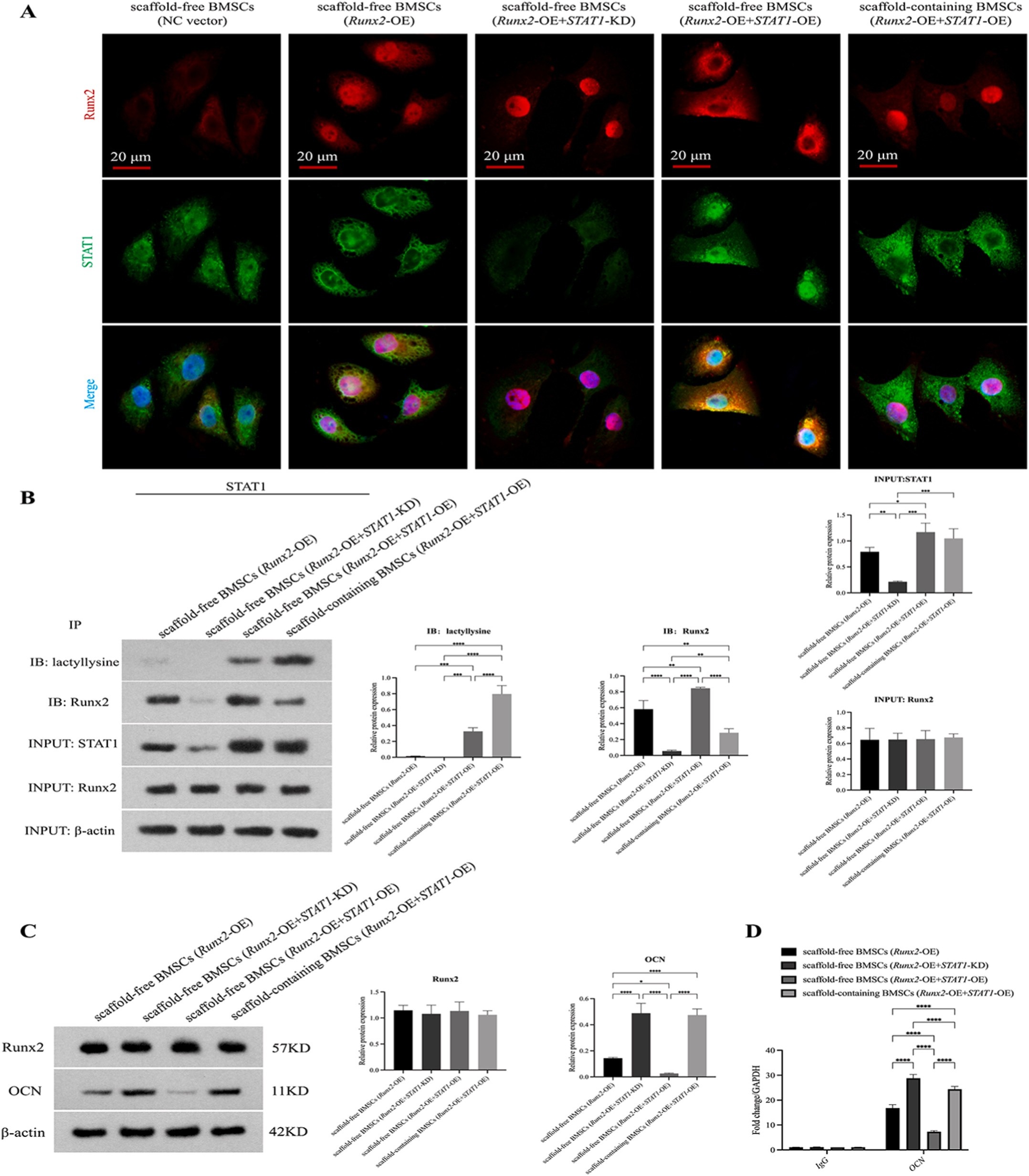 轉(zhuǎn)染后48小時進行機制檢測:免疫熒光檢測STAT1/Runx2共定位;Co-IP(STAT1抗體 pull-down)檢測乳酸化和Runx2結(jié)合;ChIP-qPCR檢測Runx2與骨鈣素啟動子的結(jié)合;Western blot檢測Runx2和OCN表達(GAPDH歸一化)。
