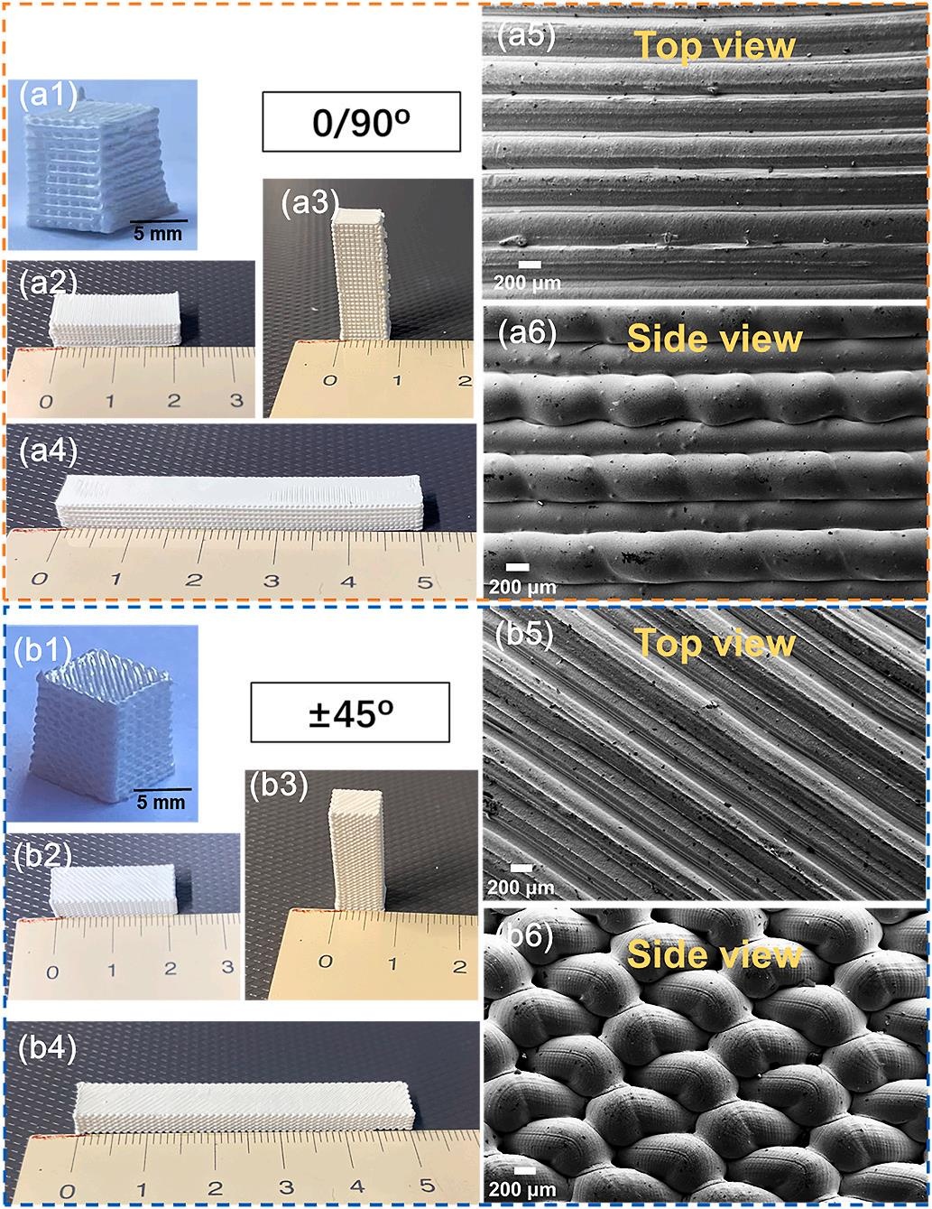 燒結樣品的光學圖像以及具有不同細絲取向的DIW基氧化鋯樣品的頂視圖和側視圖:(a1-a6) 0/90°,和 (b1-b6) ±45°。