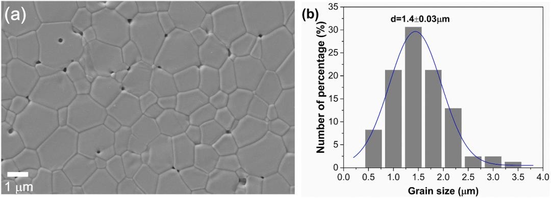 圖5:(a)燒結氧化鋯樣品的FESEM顯微照片,絲狀取向為±45°,(b)從FESEM圖像獲得的晶粒尺寸分布。