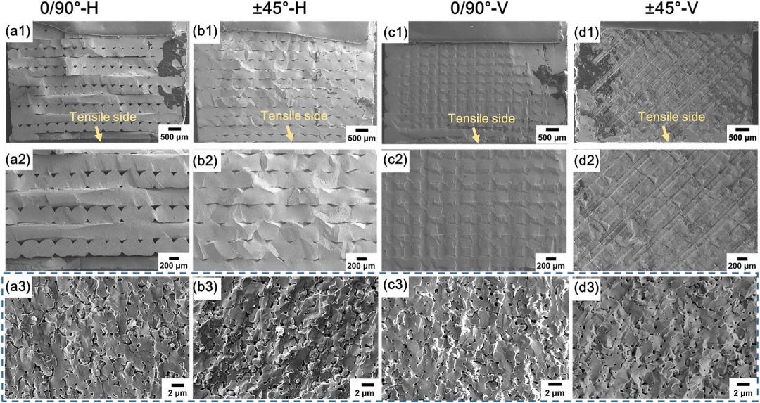 斷裂表面分析顯示,燒結后與打印設計相關的缺陷是關鍵故障位置,尤其在水平打印樣品中,孔隙率較高且層間結合不良。