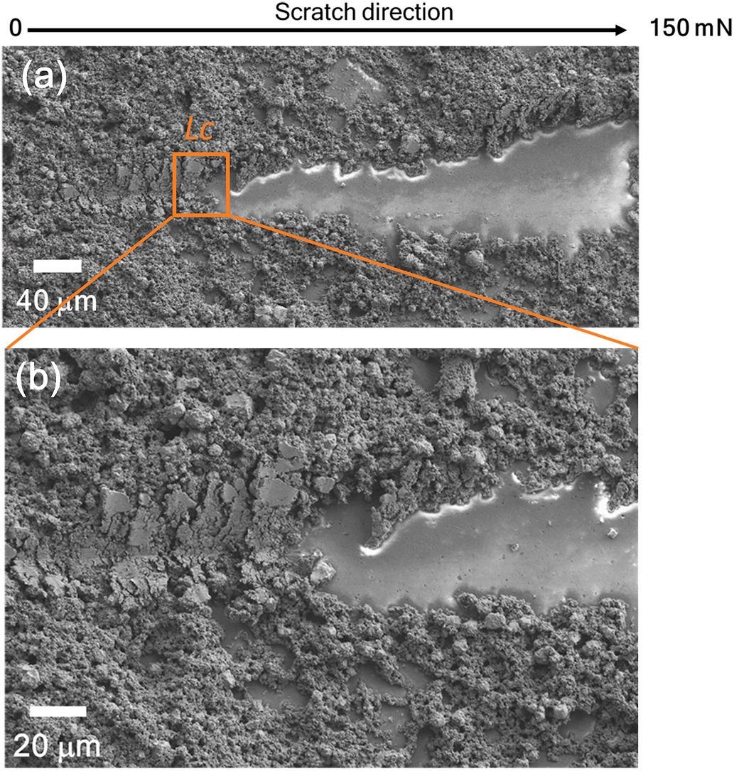 通過劃痕測試評估了絲網(wǎng)印刷銀圖案與氧化鋯基底之間的附著力。臨界負載(Lc)約為25 N,表明銀涂層與基底之間具有良好的結合強度。FESEM觀察顯示,在臨界負載下,銀涂層開始出現(xiàn)裂紋和剝落現(xiàn)象。