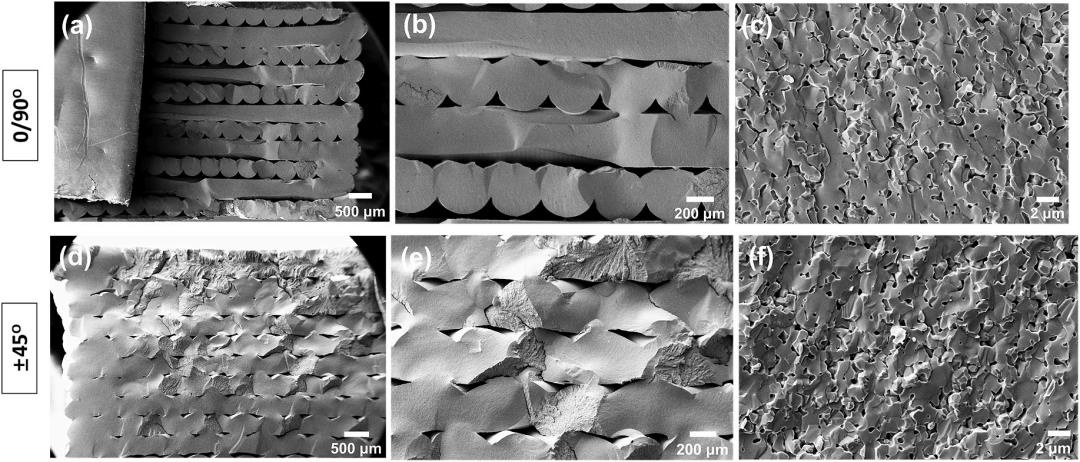 通過FESEM觀察了附有銀涂層的斷裂氧化鋯樣品的橫截面,分析了不同細絲取向對傳感器斷裂行為的影響。結果顯示,±45°細絲取向的樣品在斷裂過程中表現(xiàn)出更復雜的裂紋路徑,可能與該取向的應力分布有關。