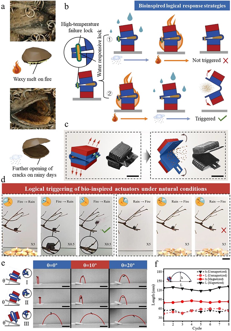本研究提出了一種新穎的仿生磁能驅(qū)動器范式,集成了環(huán)境信號觸發(fā)的瞬態(tài)響應(yīng)、邏輯門控和被動能量儲存。通過結(jié)合硬磁材料(NdFeB/PDMS)與響應(yīng)鎖定元件(相變蠟、PVP/乙醇),驅(qū)動器能夠在熱、濕度等自然刺激下實(shí)現(xiàn)快速、自主驅(qū)動。