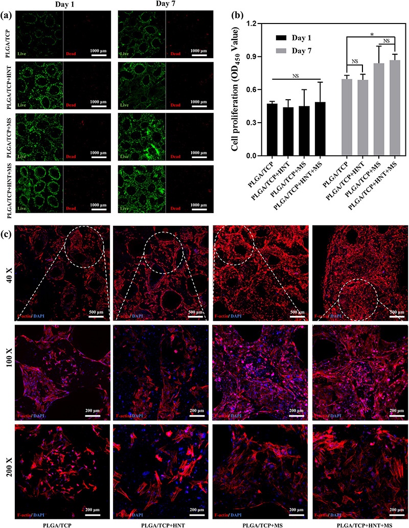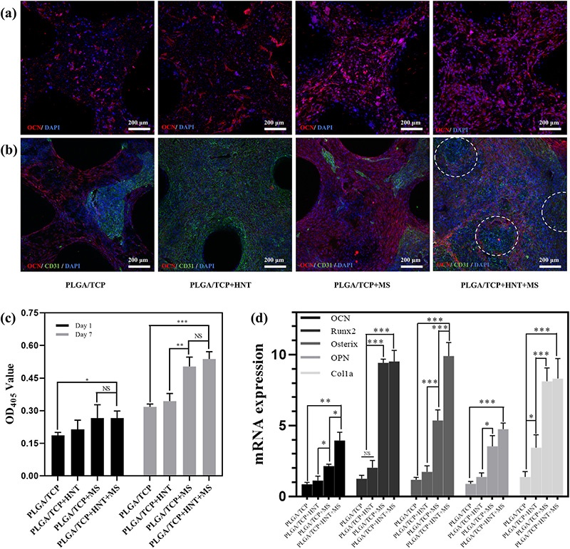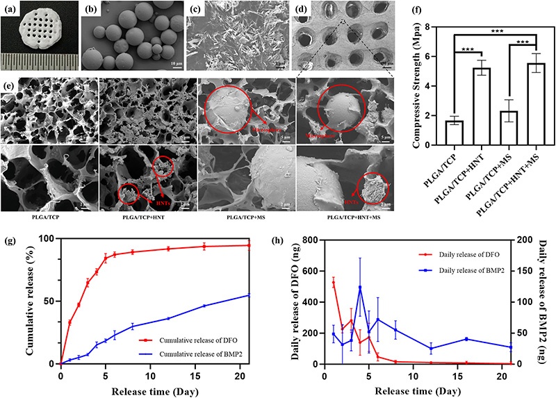 本研究成功構(gòu)建了一種基于低溫沉積3D打印技術(shù)的序貫藥物遞送支架,通過(guò)負(fù)載DFO-HNTs與BMP2-微球,實(shí)現(xiàn)了: