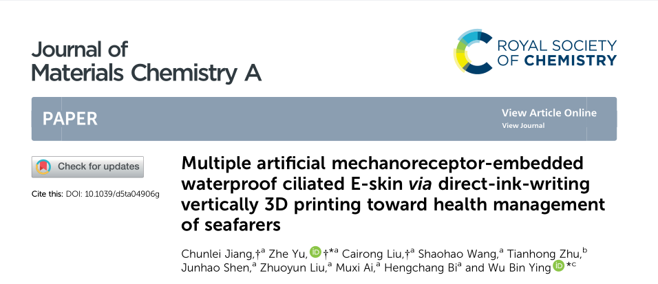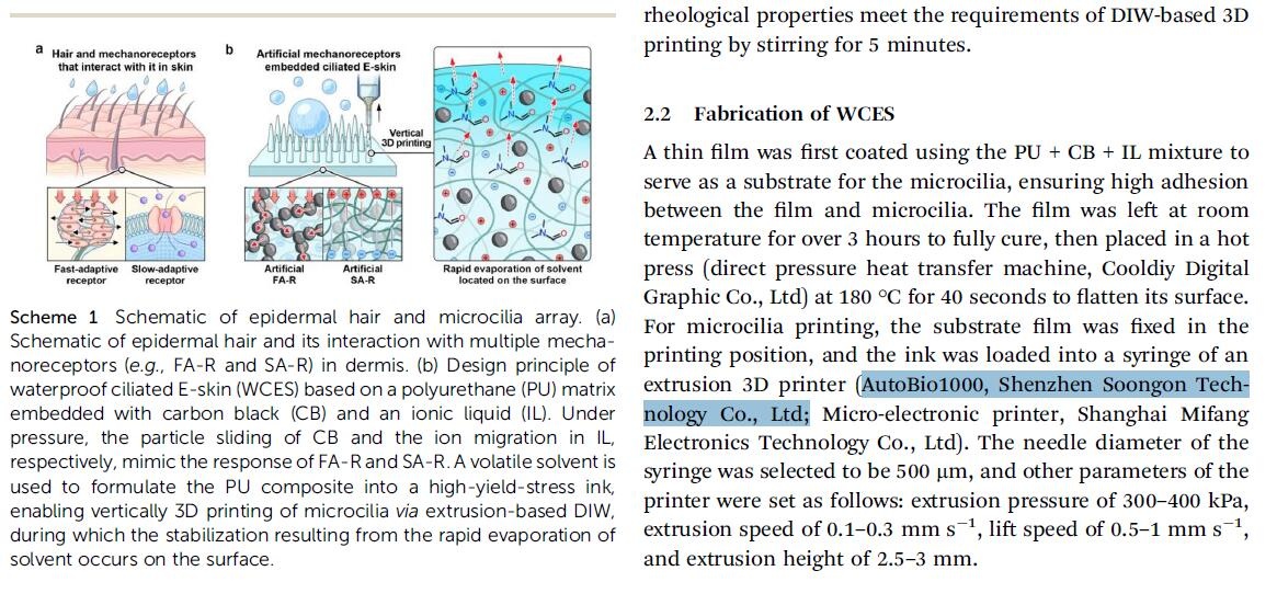 近日,華東師范大學(xué)通信與電子工程學(xué)院/集成電路學(xué)院郁哲助理研究員與韓國科學(xué)技術(shù)院(KAIST)應(yīng)鄔彬副教授在材料科學(xué)領(lǐng)域國際頂級(jí)期刊《Journal of Materials Chemistry A》發(fā)表題為 “Multiple artificial mechanoreceptor-embedded waterproof ciliated E-skin via direct-ink-writing vertically 3D printing toward health management of seafarers” 的高水平研究論文(DOI: 10.1039/d5ta04906g)。在該研究中,森工科技研發(fā)生產(chǎn)的AutoBio1000 3D打印機(jī)高效的完成了高縱橫比微纖毛的垂直 3D 打印制備環(huán)節(jié),為新型防水纖毛電子皮膚(WCES)的性能突破提供了核心技術(shù)支撐。