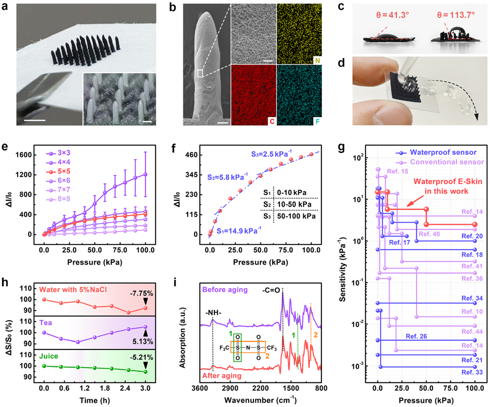 圖2: WCES的微觀結(jié)構(gòu)和電學(xué)性能。(a)垂直打印的微纖毛陣列照片。比例尺為5毫米。插圖是陣列的光學(xué)顯微鏡圖像,比例尺為1毫米。(b)單個(gè)微纖毛的SEM圖像以及通過EDS掃描得到的相應(yīng)元素分布圖像。左側(cè)SEM圖像和放大后的SEM圖像的比例尺分別為300微米和20微米。(c)在薄膜表面打印微纖毛陣列前后的水接觸角測(cè)量照片。(d)水滴在帶有微纖毛陣列的薄膜表面滾動(dòng)的測(cè)試照片。(e)具有不同密度微纖毛陣列的WCES的壓力依賴性電響應(yīng)譜。(f)具有5×5微纖毛陣列的WCES在不同壓力范圍內(nèi)的線性靈敏度。(g)本研究中垂直打印的WCES(紅色)與其他已報(bào)道的防水傳感器(藍(lán)色)和傳統(tǒng)傳感器(紫色)的靈敏度比較。(h)WCES的靈敏度隨在不同溶液中浸泡時(shí)間的變化。(i)加速老化試驗(yàn)前后樣品的ATR-FTIR光譜。