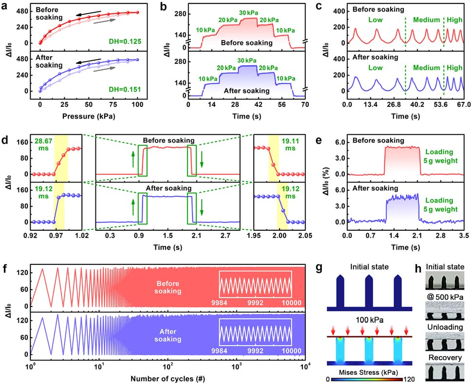 圖 3 水合碳電極傳感器(WCES)浸泡前后其他傳感性能的變化,包括動(dòng)態(tài)范圍(DH)(a)、重現(xiàn)性(b 和 c)、響應(yīng)時(shí)間(RT)(d)和檢測(cè)限(LoD)(e)。(f)水合碳電極傳感器(WCES)浸泡前后經(jīng)過 10000 次循環(huán)的穩(wěn)定性測(cè)試結(jié)果。(g)通過有限元分析得到的 100 千帕壓力下微纖毛的應(yīng)力分布。(h)顯示壓力加載 - 卸載過程中微纖毛過載情況的照片。