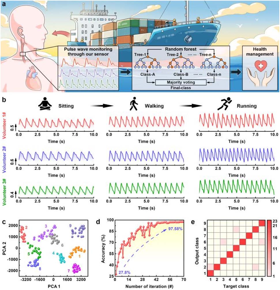 基于 AutoBio1000 制備的 WCES,團(tuán)隊(duì)進(jìn)一步構(gòu)建了船員健康管理系統(tǒng):在 80% 相對(duì)濕度環(huán)境中,將 WCES 貼附于頸動(dòng)脈處,可清晰捕捉脈搏信號(hào)(含 3 個(gè)特征峰),并結(jié)合隨機(jī)森林(RF)機(jī)器學(xué)習(xí)模型對(duì)不同生理狀態(tài)(靜坐、行走、慢跑)下的脈搏信號(hào)進(jìn)行分類,識(shí)別準(zhǔn)確率高達(dá) 97.58%。