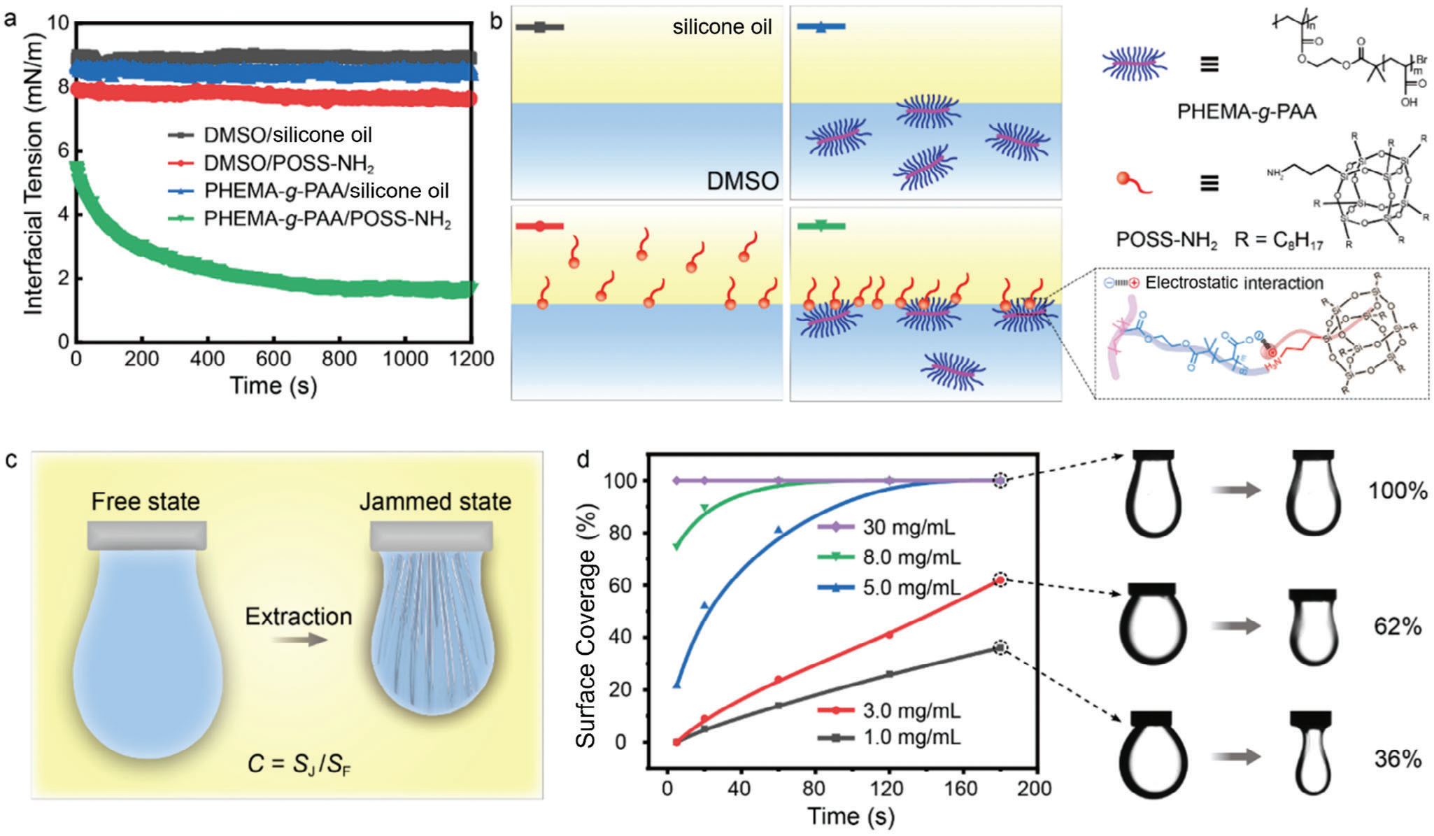 研究采用極性分子刷聚(甲基丙烯酸2-羥乙酯)-g-聚(丙烯酸)(PHEMA-g-PAA)與非極性低聚配體胺功能化多面體低聚倍半硅氧烷(POSS-NH?),在二甲基亞砜(DMSO)-硅酮油界面共組裝形成新型分子刷表面活性劑(MBSs)。