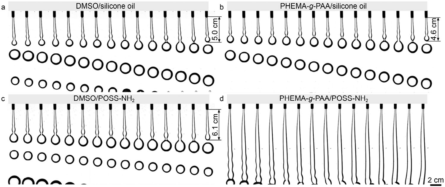 利用3D打印機控制含PHEMA-g-PAA的DMSO液體的空間排列,通過調(diào)節(jié)打印頭速度和流速,在含POSS-NH?的硅酮油中成功打印出S形、花朵形和松鼠形等復雜結(jié)構(gòu)的液體絲線,所有打印結(jié)構(gòu)穩(wěn)定性優(yōu)異,一周內(nèi)保持形態(tài)不變。