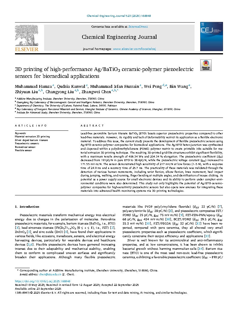 3D打印高性能Ag/BaTiO?陶瓷-聚合物壓電傳感器,賦能生物醫(yī)學應(yīng)用