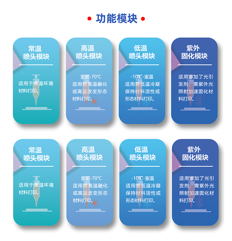 基于用戶打印材料為粉末,顆粒以及流體等不同形態(tài)高分子材料的需求,利用我司AutoBio系列墨水直寫3D打印機(jī)可根據(jù)需求進(jìn)行多種外場輔助拓展的特點(diǎn),適配300℃高溫噴頭模塊,解決用戶科研原材料價格昂貴、材料調(diào)配困難,打印材料具備不同形態(tài)、傳統(tǒng)材料成型測試模型單一等難題,為可回收高分子材料研發(fā)提供低成本,更優(yōu)質(zhì)高效的解決方案。