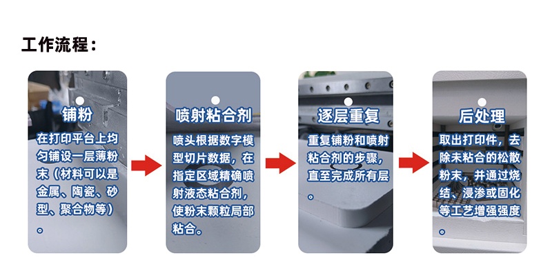 技術類型:粘結劑噴射3D打?。˙inder Jetting,BJ)是一種基于粉末材料的增材制造技術,通過逐層噴射粘合劑將粉末顆粒粘合,最終形成三維物體。
