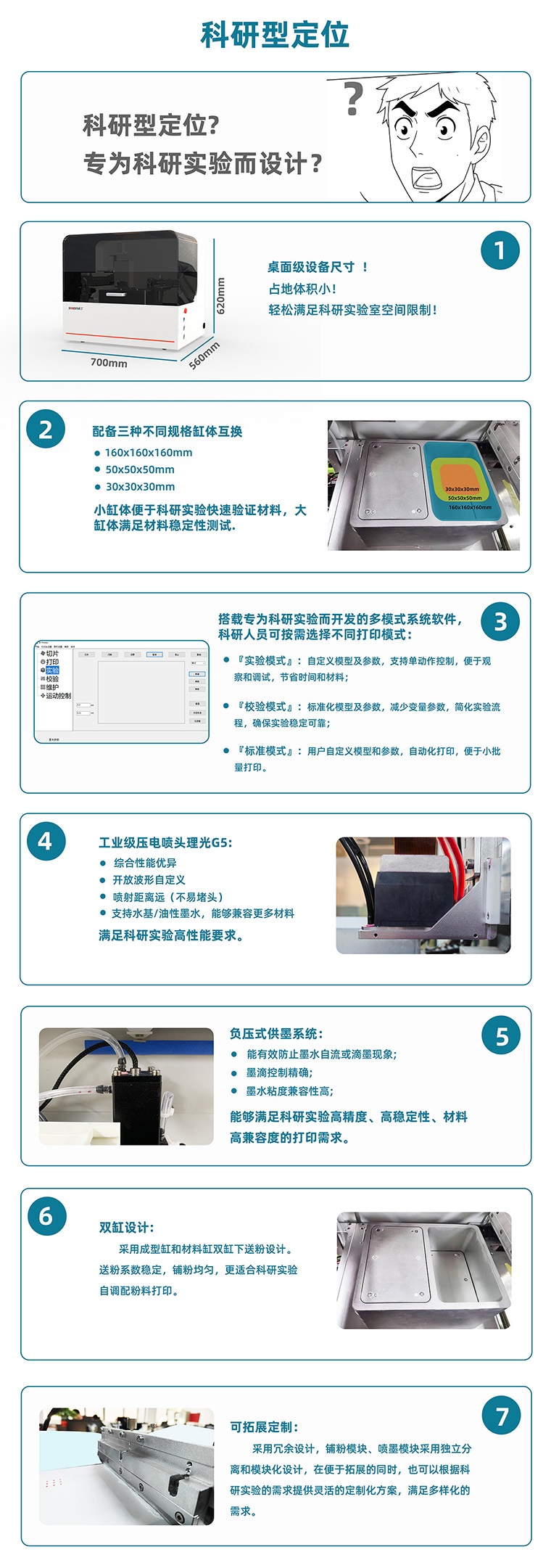 科研型3D打印機(jī),具有高精度、多參數(shù)、數(shù)字化、多模式、可拓展、多材料、多尺寸、高性價比等優(yōu)點,能夠滿足復(fù)雜科研實驗需求。
